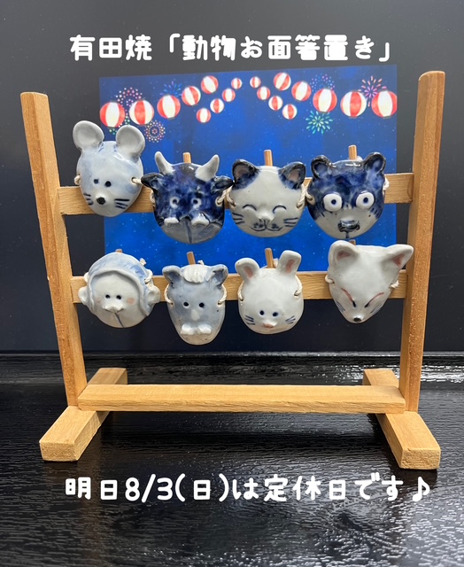 有田焼の 「動物お面箸置き揃」¥7150 ほとんどの動物は 耳のところに箸を置く形ですが 耳が短かったりひっかかりがない 動物は顔面に直接置く形に なりそうです(サルとクマ) 箸置きで使用するより 飾り台付きなので インテリアとして楽しむのが おすすめです( *´艸`) ※明日8/3(日)は定休日です🎵